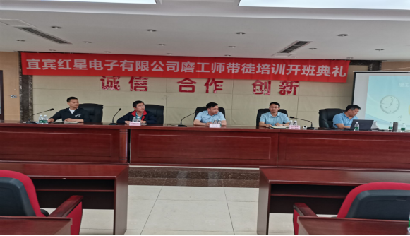 2021年5月10日下午14点,叙州区磨工师带徒培训开班典礼在宜宾红星电子有限公司会议室如期举行,现场掌声阵阵,气氛热烈。这次培训是由叙州区人社局牵头,宜宾红星电子有限公司、宜宾职业技术学院汽车与轨道交通学院联合承办。我院充分发挥高职院校师资力量和技术优势,积极服务地方企业发展,以提高叙州区企业职工职业技能为目标,助推企业市场竟争力。