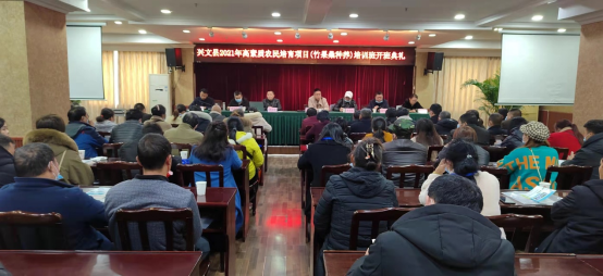 在兴文县农业农村局指导下、石海茧丝绸有限公司支持配合下,宜宾职业技术学院作为承训机构,在做好疫情防控的基础上,于2021年11月28日在兴文县洞乡大酒店会议室举办了竹桑果培训班开班仪式。兴文县农业农村局总农艺师阎果、统计股股长李登奎、农业技术培训中心主任夏玉会,兴文县石海茧丝绸有限公司副总刘立志、书记汪中林、副总秦继彬,宜宾职业技术学院项目负责人员参加了本次开班仪式。