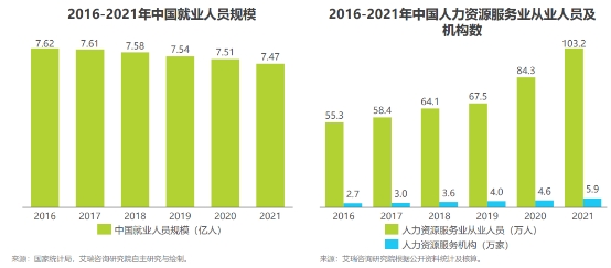 过去几年,我国劳动力市场一直呈现供不应求的状态,就业人员规模呈现下降趋势,截至2021年,我国就业人员规模下降至7.47亿。但相对的,我国整体人才需求不断上涨。根据人力资源和保障事业发展统计公报,截至2021年,我国人力资源服务机构共5.9万家,人力资源服务业从业人员达103.2万人。