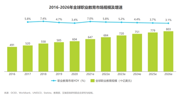 在全球职业教育发展宏观背景向好的大环境下,预计2022年全球职业教育市场规模将达到6840亿元,并在2026年超过8000亿美元。