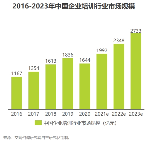 企业培训一方面能为基层员工提升完成本职工作所需要的知识、技能、经验、能力等素质,另一方面能培养贴合企业自身实际发展战略需求的高级管理人员。艾瑞咨询数据显示,预计2023年我国企业培训行业市场规模将达到2733亿元。