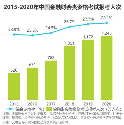 根据国家统计局的数据,我国金融业总体呈现稳健增长态势,内部岗位的分化以及对从业人员专业度要求的提升推动着从业人员持续提升自身职业素养,2020年中国金融财会类资格考试报考人次已超过1200万人次。