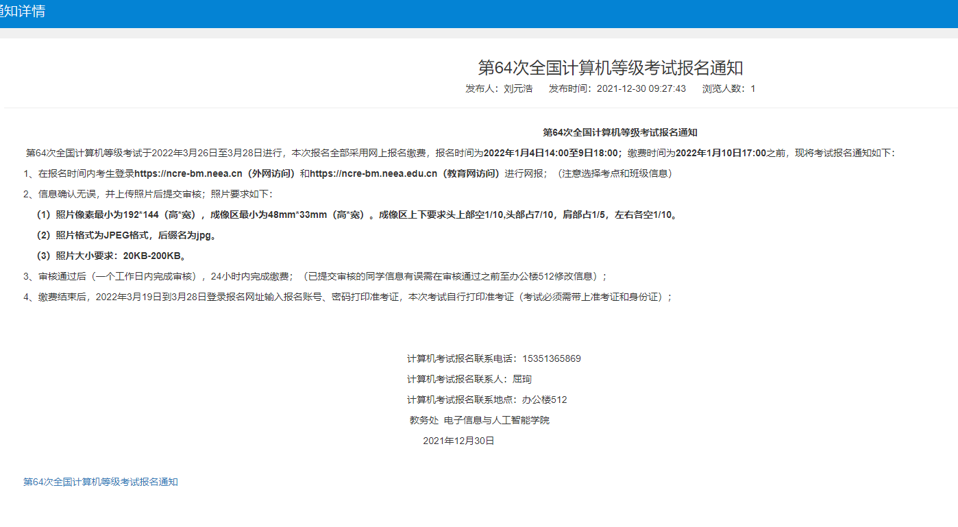 《第64次全国计算机等级考试报名通知》已挂教务系统和本群,请通知学生网上报名和缴费。